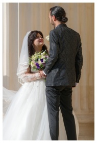 A couple playfully peeks from a traditional Chines