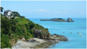 Stunning coastal landscape of Cancale, France featuring cliffs and turquoise sea.