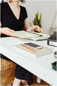 Faceless woman organizing documents at office desk with phone and notebook, focus on productivity.