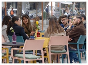 A vibrant street filled with people and trees, sho
