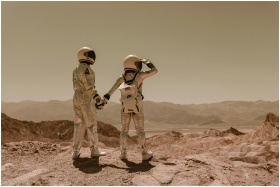 Two astronauts holding hands, exploring rocky Mars