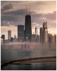 Beautiful skyline of Chicago with towering skyscrapers and misty waterfront at dusk.