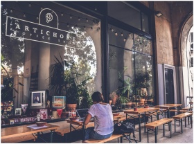 Atmospheric exterior view of a cozy cafe with wooden tables and a person working on a laptop.