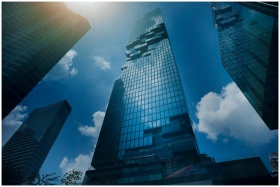 Dramatic view of modern skyscrapers amidst clouds