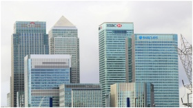 Modern skyline of Canary Wharf featuring iconic bank skyscrapers like HSBC and Barclays.