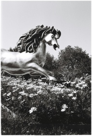 Black and white photo of horse statue surrounded by flowers in Istanbul, Turkey.