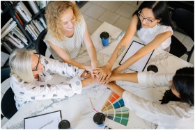 Overhead view of diverse women collaborating in a modern office setting, showing teamwork and unity.