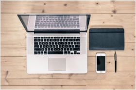 Top view of a tidy workspace featuring a laptop, smartphone, notebook, and pen on a wooden desk.
