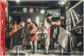 A bustling barbershop with two men getting haircuts, showcasing a vibrant barber environment.