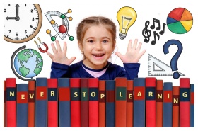 Flat lay of colorful notebooks, pen, and fuzzy pom