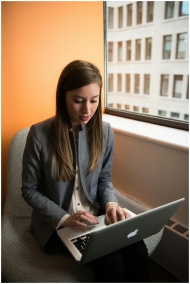 Businesswoman in office working remotely on a laptop by the window.