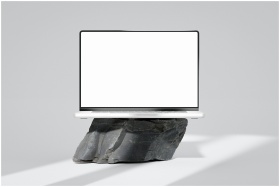 A minimalist image of a laptop with a blank screen, creatively placed on a rock for emphasis.