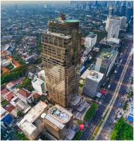 High-rise buildings and bustling streets captured from above in Jakarta, Indonesia.