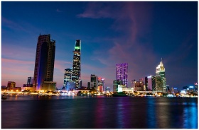 A stunning evening view of Ho Chi Minh City's skyline reflecting vibrant lights over the Saigon River.
