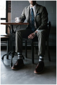 A man in a designer suit enjoys coffee in a chic cafe setting.