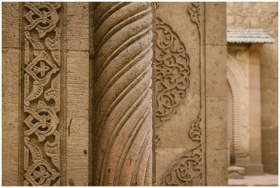 Detailed view of Islamic stone carvings showcasing ornate geometric patterns and motifs.