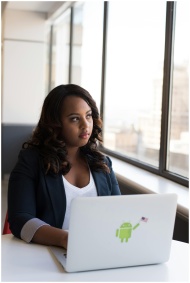 Focused woman using a laptop with Android sticker, sitting by a window in an office.