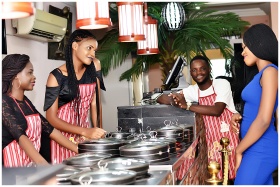 Friendly interaction among restaurant workers and