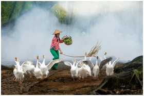 Colorful scene of a farmer herding geese in a mist