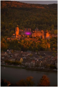 Heidelberg Castle illuminated at dusk with a historic town view, perfect for travel inspiration.
