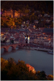Stunning aerial photo capturing Heidelberg's historic center and Neckar River at sunset.