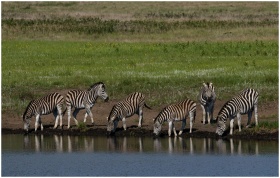 A group of zebras drinking at a waterhole in the lush grasslands of South Africa.