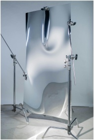 Elegant abstract distortion on a reflective metal sheet, studio setting.