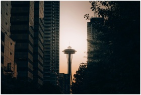 The Space Needle framed between modern skyscrapers at sunset in Seattle.