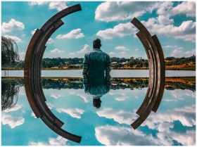 A man in a denim jacket sits by abstract sculpture reflecting on the water under a blue sky.