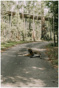 A Bengal tiger rests on a shaded road surrounded by trees in a Vietnamese zoo.