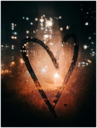 Heart drawn on glass of wet window with view of light of buildings on city street at night