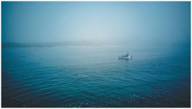 A captivating aerial view of a boat surrounded by mist on a tranquil ocean with seabirds.