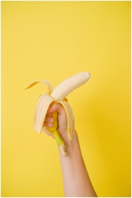 Crop anonymous female holding half unpeeled ripe organic banana against bright yellow background before eating