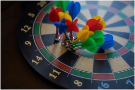 A close-up shot of colorful magnetic darts clustered on a dartboard, showcasing precision.