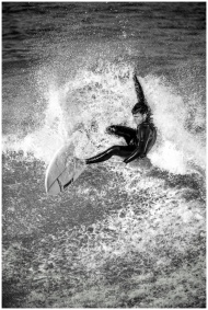 Capturing a surfer in motion with an impactful black and white wave splash.