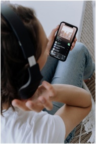Person wearing headphones, using a smartphone to listen to music in a comfortable setting.