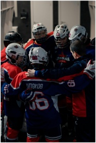 A youth hockey team gathers in a circle for a motivational huddle before a game.