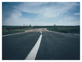 A long straight road stretches through fields unde