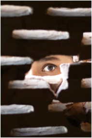 A mysterious eye peeks through a small gap in a br