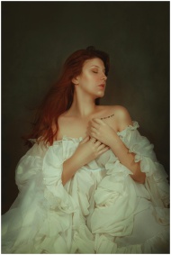 Elegant portrait of a woman with red hair in a white dress, eyes closed, embodying a renaissance style.