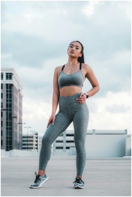 Young woman in grey activewear standing confidently on a rooftop against a cloudy sky.