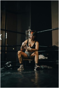 A female boxer wraps her hands while sitting in a boxing ring during training inside a gym.