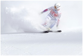 A skier in motion navigating a snowy slope with speed and precision during a winter sports event.