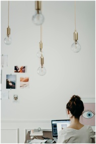 Woman working at a desk in a modern creative office, surrounded by mood boards and hanging lightbulbs.