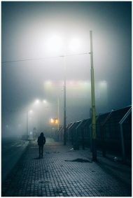 A silhouette of a person walking on a foggy street illuminated by streetlights, creating an atmospheric night scene.