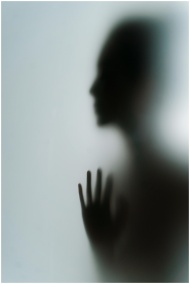 Abstract silhouette of a person with hand on frosted glass, creating an artistic blurry effect.