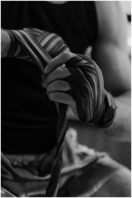 Grayscale photo of an athlete wrapping hands, focusing on wrapped fingers and forearm.