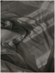 A minimalist photo capturing the artistic play of shadows on crumpled white bed sheets.