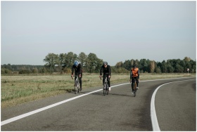 Three cyclists enjoying a scenic road cycling adventure under clear skies, embracing the great outdoors.