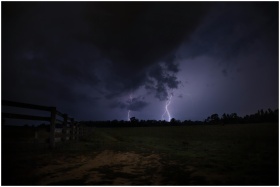 Intense lightning illuminates a dark field, captur